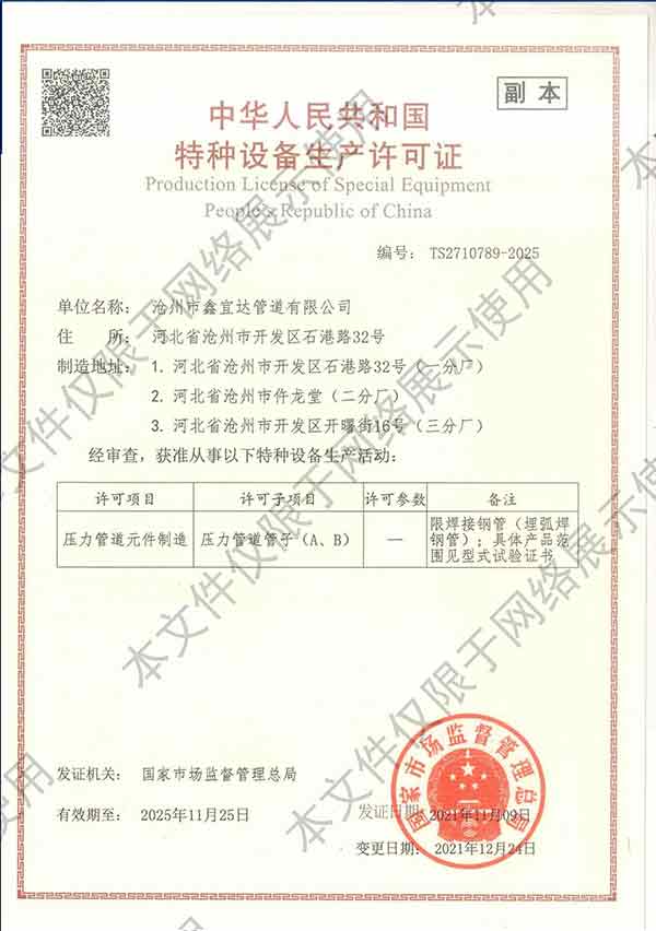 滄州市鑫宜達(dá)管道有限公司成立于2003年7月,坐落于滄州經(jīng)濟(jì)開(kāi)發(fā)區(qū),占地面積40萬(wàn)平方米,注冊(cè)資金1.81億元,是集螺旋鋼管生產(chǎn)、防腐加工以及無(wú)縫鋼管、卷板、帶鋼等品類(lèi)鋼材經(jīng)營(yíng)銷(xiāo)售于一體的工貿(mào)型企業(yè)。公司現(xiàn)有員工400多人,其中,中高級(jí)技術(shù)職稱(chēng)的人員達(dá)120余名。 滄州市鑫宜達(dá)管道有限公司擁有9條螺旋鋼管生產(chǎn)線(xiàn)和3PE防腐生產(chǎn)線(xiàn),可生產(chǎn)直徑219--3640mm,壁厚5.5--28mm,最高鋼級(jí)X100的各種規(guī)格防腐螺旋鋼管...